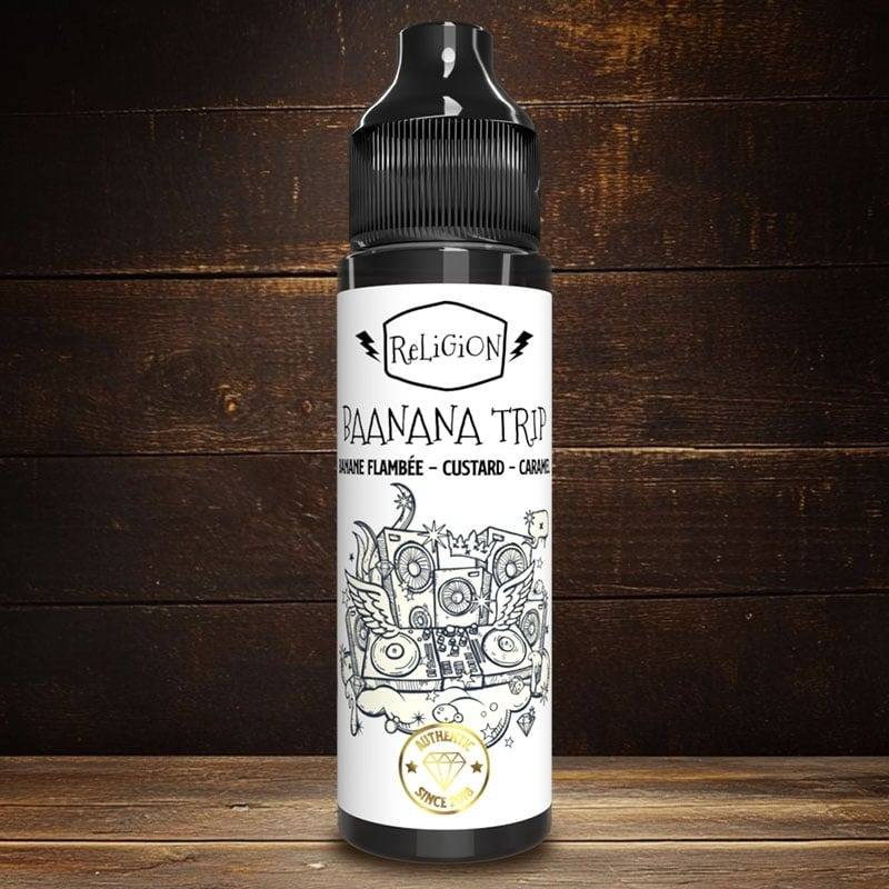 E-liquide BAANANA TRIP 50ML - RELIGION JUICE. 50 ml. Saveurs : banane, caramel et custard. Origine du liquide : France.